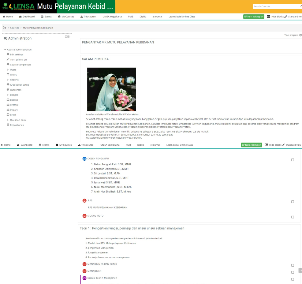 - For the educational process, lecturers and students use LENSA (e-learning UNISA), which contains semester learning plans (RPS), modules, practical guides, and tutorials. Lecturers and students also optimize LENSA (https://lensa.unisayogya.ac.id/course) as a discussion forum, communication-related to assignments and lectures, assignment collection to assessment grading (figure 1)