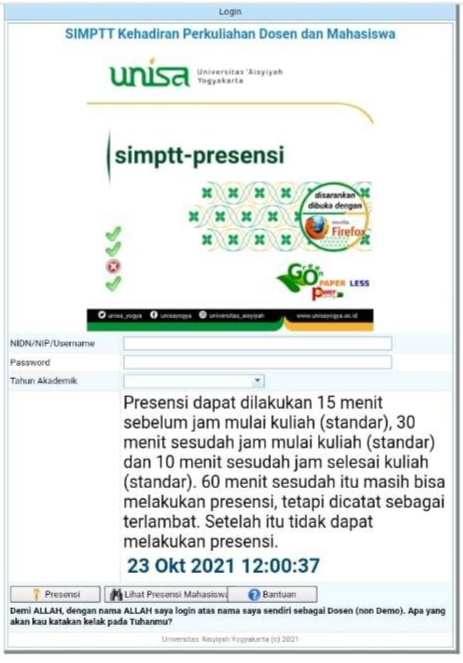 - For attendance purposes, lecturers use a PTT SIM (https://sim.unisayogya.ac.id:8443/simptt-presensisiswa/), which includes student attendance meetings materials, and types of Surahs and Al-Quran verses that cited before starting the learning class ( figure 2).